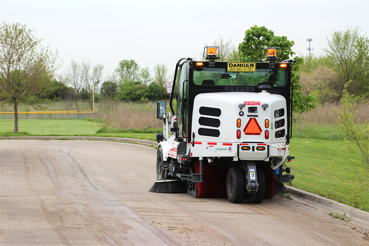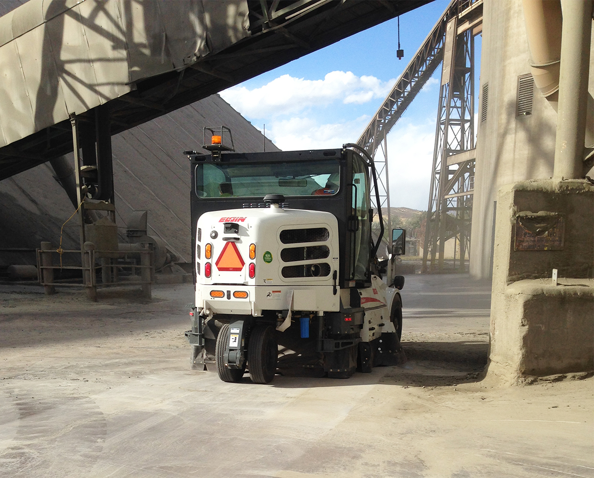 The Pelican is also available with Elgin's innovative waterless dust control feature; allowing year-round sweeping, sweeping with water conservation, and eliminating water use on reactive compounds like Portland cement.